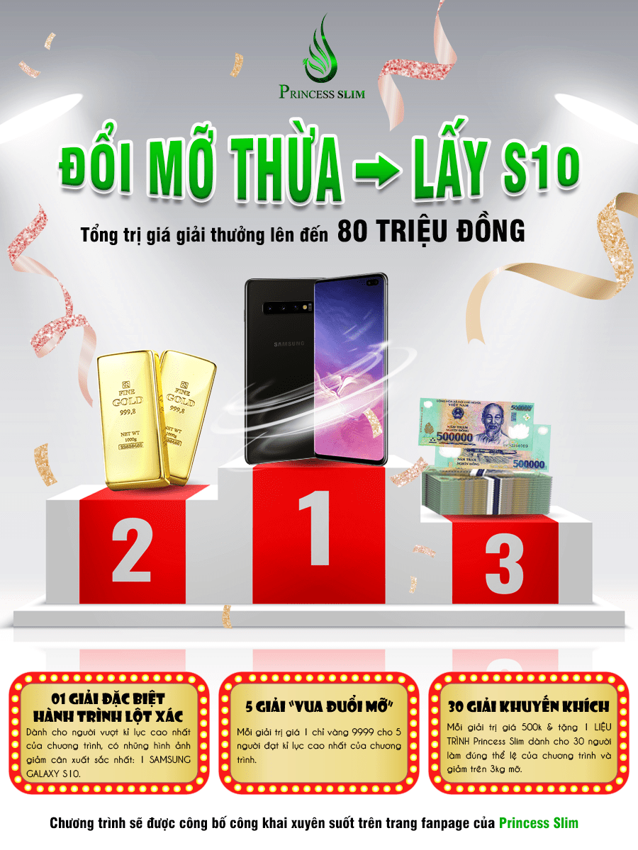 30 giải khuyến khích mỗi giải trị giá 500K và 1 liệu trình Princess Slim dành cho 30 người làm đúng thể lệ của chương trình và giảm trên 3kg mỡ.
